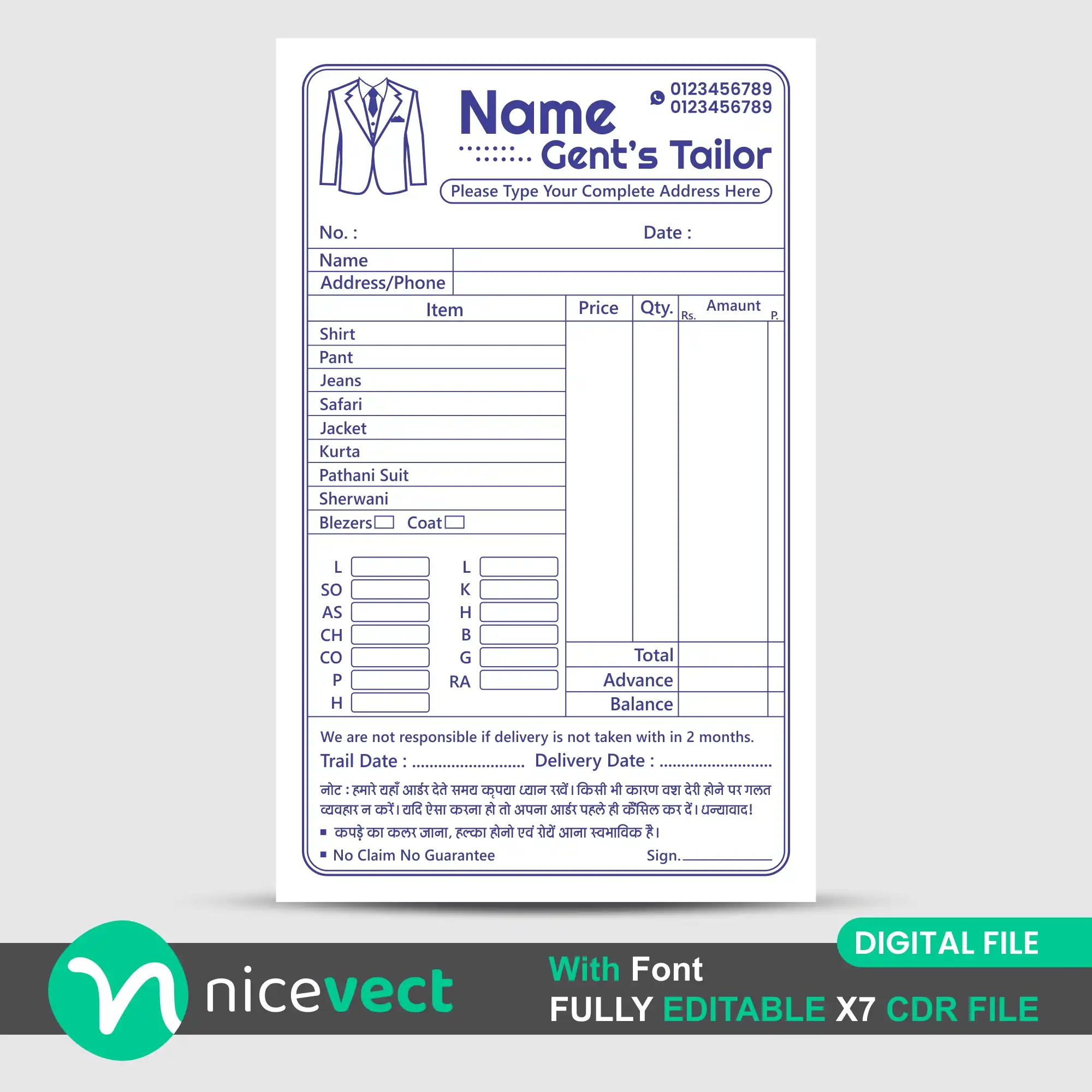 Premium Gents Tailor Bill Book Design in fully editable CDR format. This print-ready CorelDRAW template is designed for tailor shops, printers, and graphic designers. The file is well-organized, easy to customize, and can be resized as needed. Suitable for CorelDRAW X7 and above versions. Fonts are included, so you can edit the design without any font issues.
