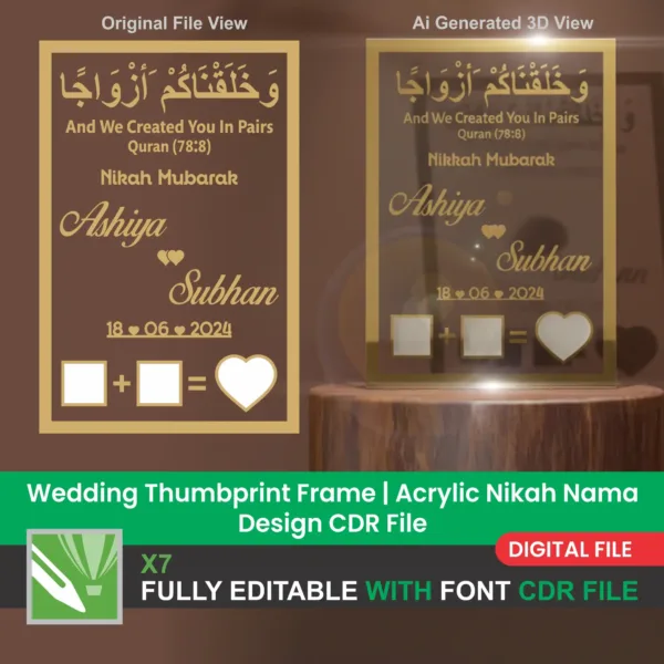 The Wedding Thumbprint Frame Acrylic Nikah Nama Design CDR File is a beautifully crafted digital product designed for designers, laser cutting professionals, and acrylic craft makers. This elegant design combines modern aesthetics with a personal touch, making it perfect for wedding gifts, Nikah ceremonies, and customized décor.
